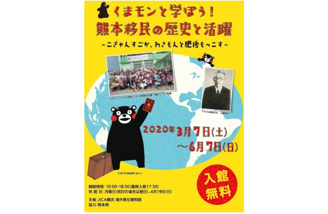 JICA横浜海外移住資料館では、4月から、熊本県から海を渡たり、世界各地で活躍した移民を紹介する企画展示「くまモンと学ぼう!熊本移民の歴史と活躍 ―こぎゃんすごか、わさもんと肥後もっこす―」を行う。