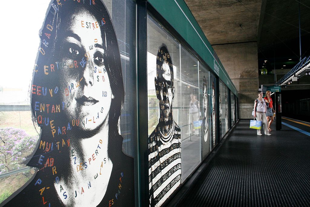 全部で22人分が飾られており、モノクロームの人物の画像には、ブラジルのさまざまな作家が残した詩の一辺が色とりどりのフォントで記されている。