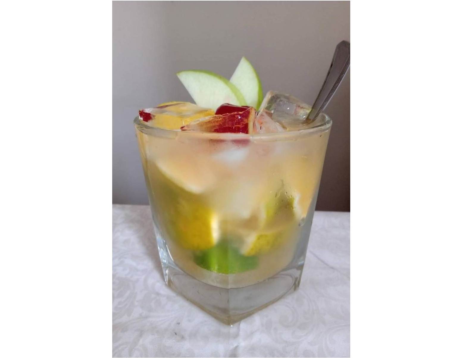 背の低いグラスにフルーツ類と砂糖を入れ、サカドールで潰す。氷、カシャッサ、St. Remyを加え、よく混ぜる。スライスしたりんごと、さくらんぼを飾りに乗せて完成。