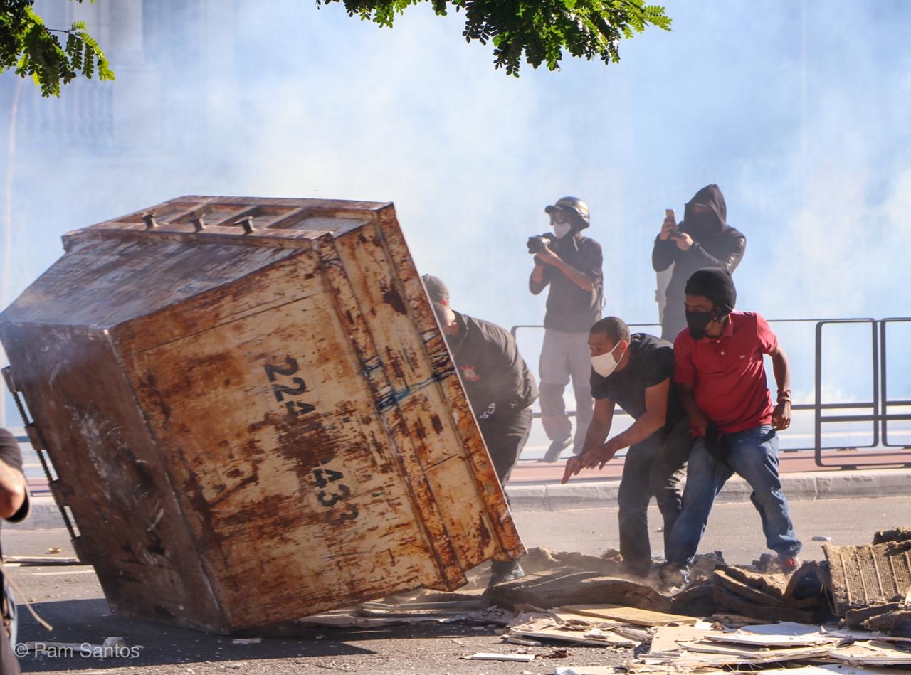 両グループの間に陣をとった軍警察が挟まれる形となり、15時ころには緊張が高まり、デモ参加者が投石を始めたことから軍警察はガス弾やゴム弾などを使用して騒動を鎮圧した。騒動の中で5名の逮捕者がでたという。