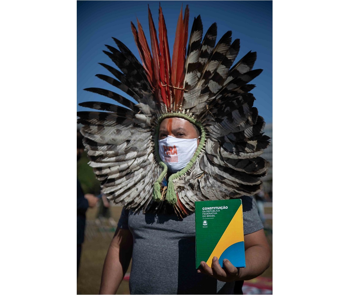 7月14日、ブラジリア、国会議事堂前。ボウソナーロ大統領の弾劾要求の提出に合わせて行われたデモ参加した先住民。手中にはブラジル連邦共和国憲法。マスクには「ボウソナーロ大統領は退陣せよ」のメッセージ(写真/Gabriel Paiva)
